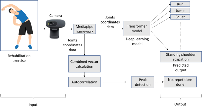 For activity recognition, we employed a transformer encoder-based deep-learning model. An RGB camera captures the video frames and joint coordinates are extracted using Mediapipe open source framework. The extracted joint coordinates are further processed to identify the performed activity. Additionally, the captured coordinates are analyzed using auto-correlation and peak detection techniques to count the number of repetitions. Figure 1 presents an overview of the proposed framework. A detailed description of the proposed method is presented in the later sections.